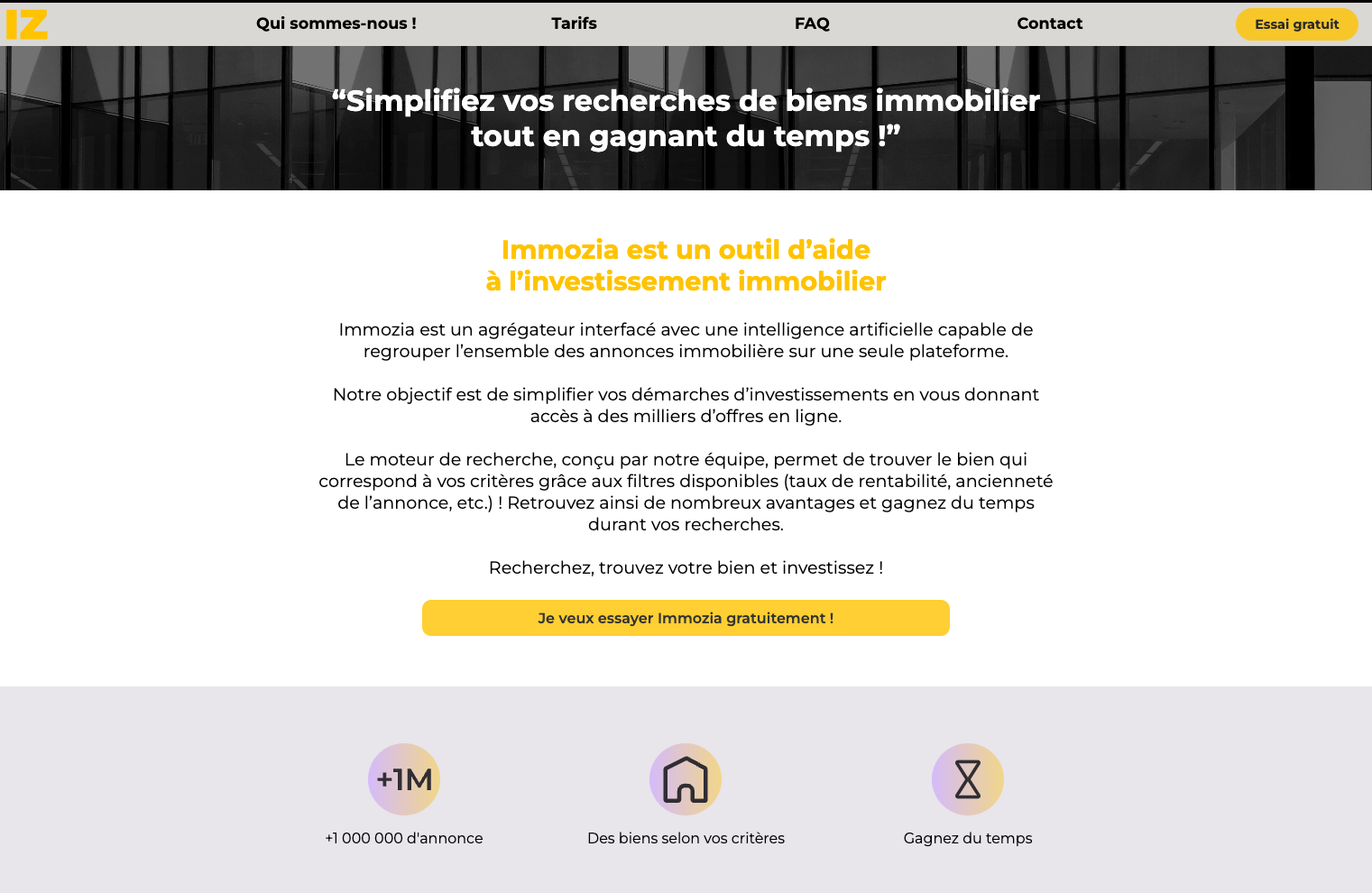 Immozia est un agrégateur de bien immobiliers. le système parcours le web pour être au courant des annonces le plus vite possible et vous permet d’investir au meilleur moment sur les biens d’une zone.
