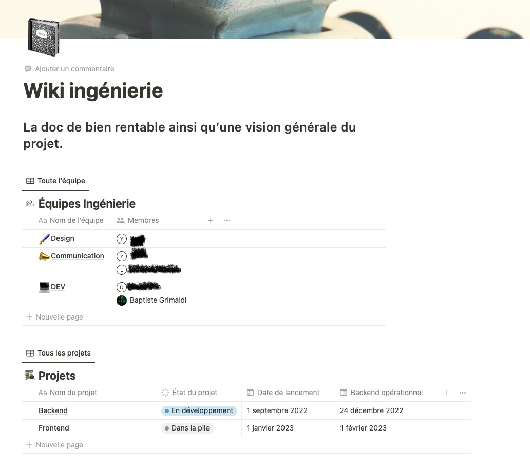Le wiki ingénieur du Notion est un espace partagé pour l'équipe de développement où sont stockées toutes les informations liées au projet. Il s'agit d'un outil de collaboration qui permet à chaque membre de l'équipe de contribuer à la documentation et de la mettre à jour au fur et à mesure que le projet avance. La documentation est rédigée en utilisant une syntaxe de balisage simple pour faciliter la lecture et la compréhension.