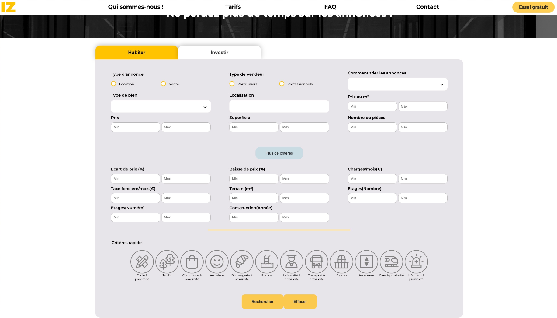 - Des critères poussés: Toujours dans l'objectif de faciliter vos recherches, nous avons pensé les critères de recherche pour que vous puissiez trouver votre bien en seulement quelques clics.