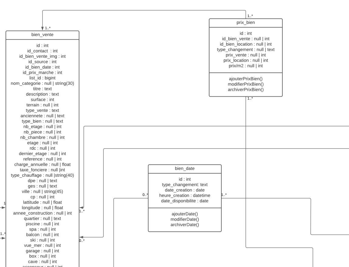Les tables bien_vente et location sont également liées à d'autres tables qui contiennent des informations supplémentaires sur les biens, telles que les différents prix trouvés, les différentes date de publication, etc… . Toutes ces informations sont essentielles pour aider les clients à prendre des décisions éclairées lorsqu'ils cherchent à acheter ou à louer un bien immobilier. En fin de compte, notre système repose sur la qualité des données stockées dans ces tables et sur notre capacité à les rendre accessibles et utilisables pour nos clients.